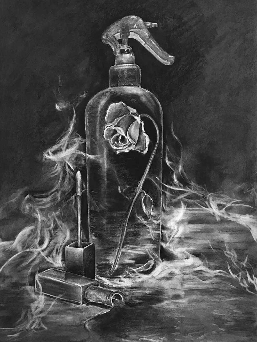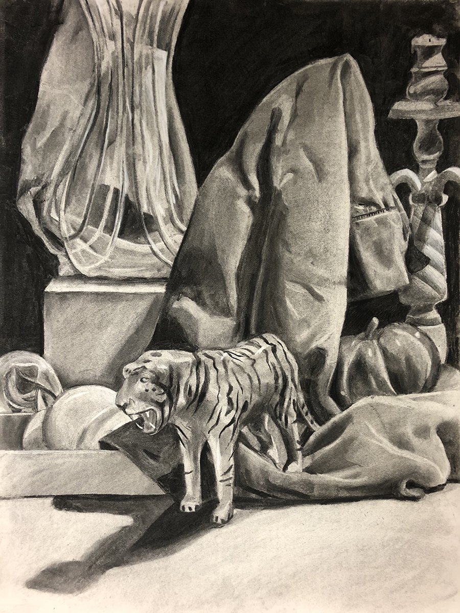 Observational still life drawing with value and added narrative elements, charcoal on paper, 22x30”