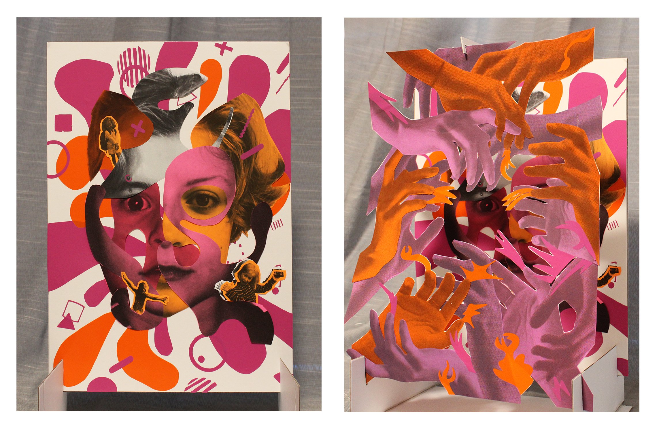 Two-dimensional design that includes a three-dimensional viewing experience, digital and analog collage, two pieces mounted on illustration board with constructed stand