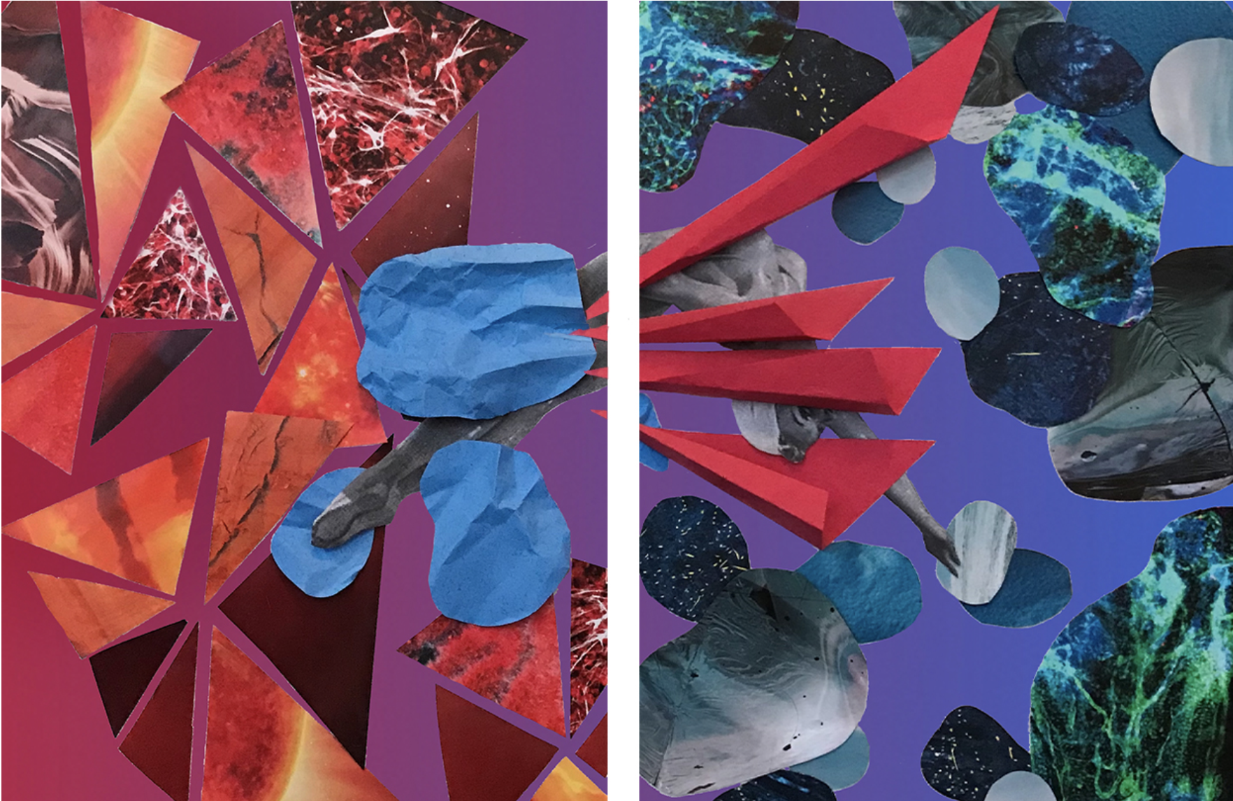 Color and two-dimensional design, evolving color and shape across a two-page spread, digital and analog collage mounted on illustration board, 11x17”