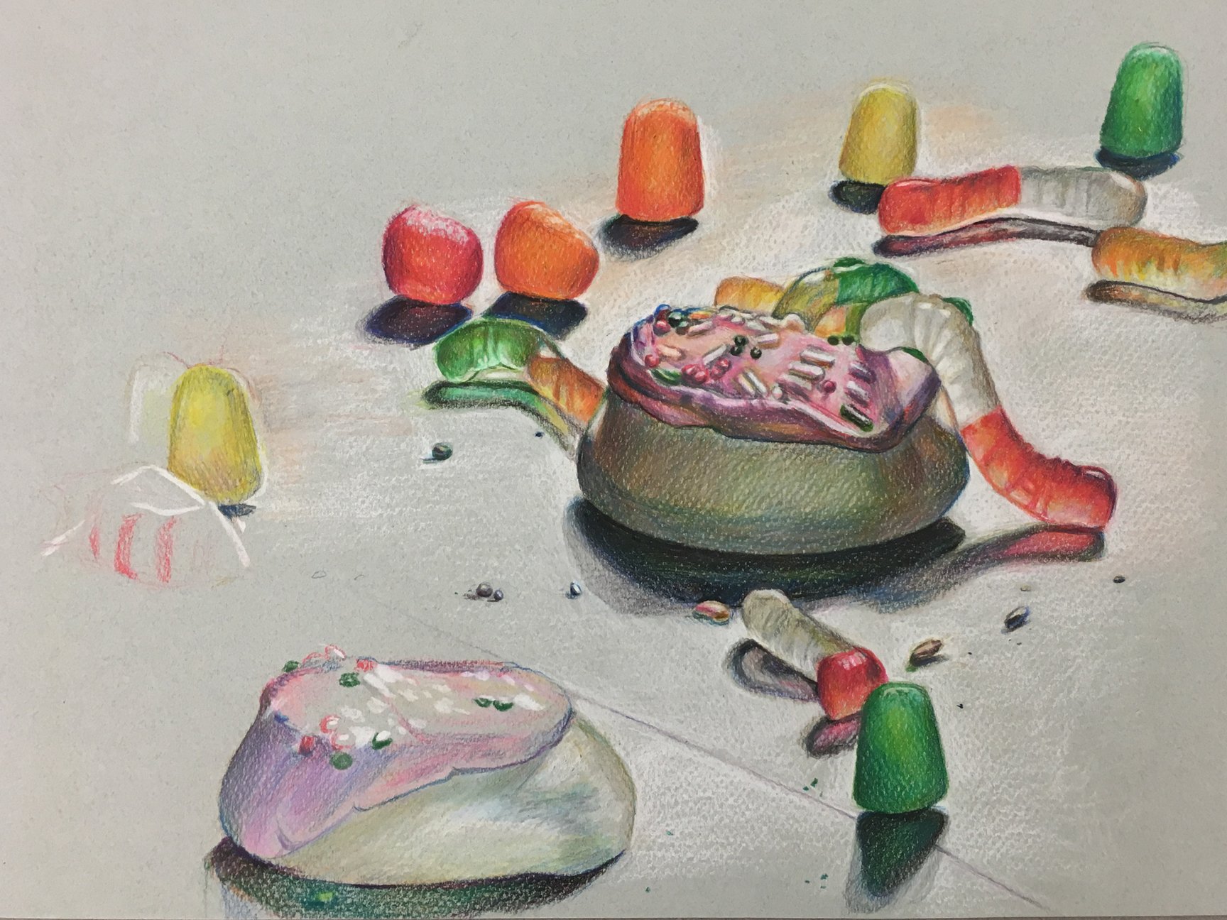 Observational still life drawing with color, color pencil on paper, 14x16”