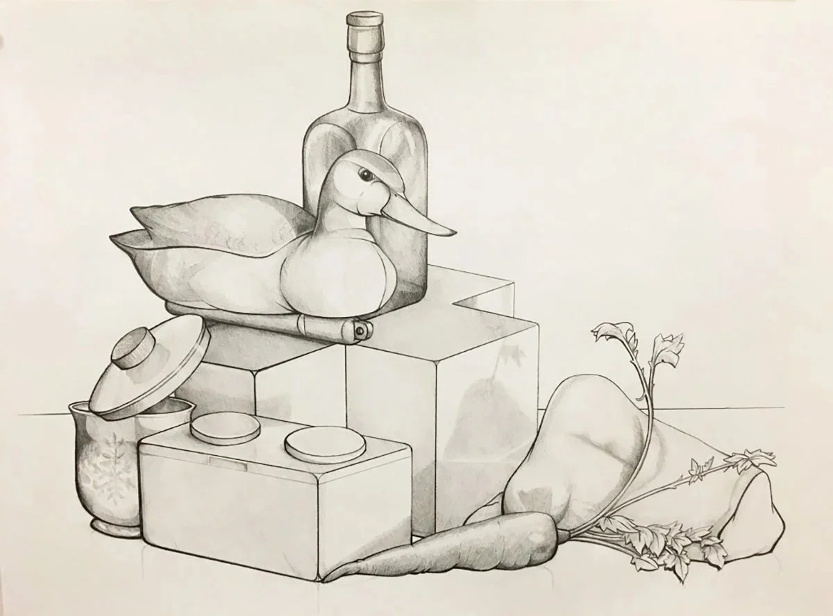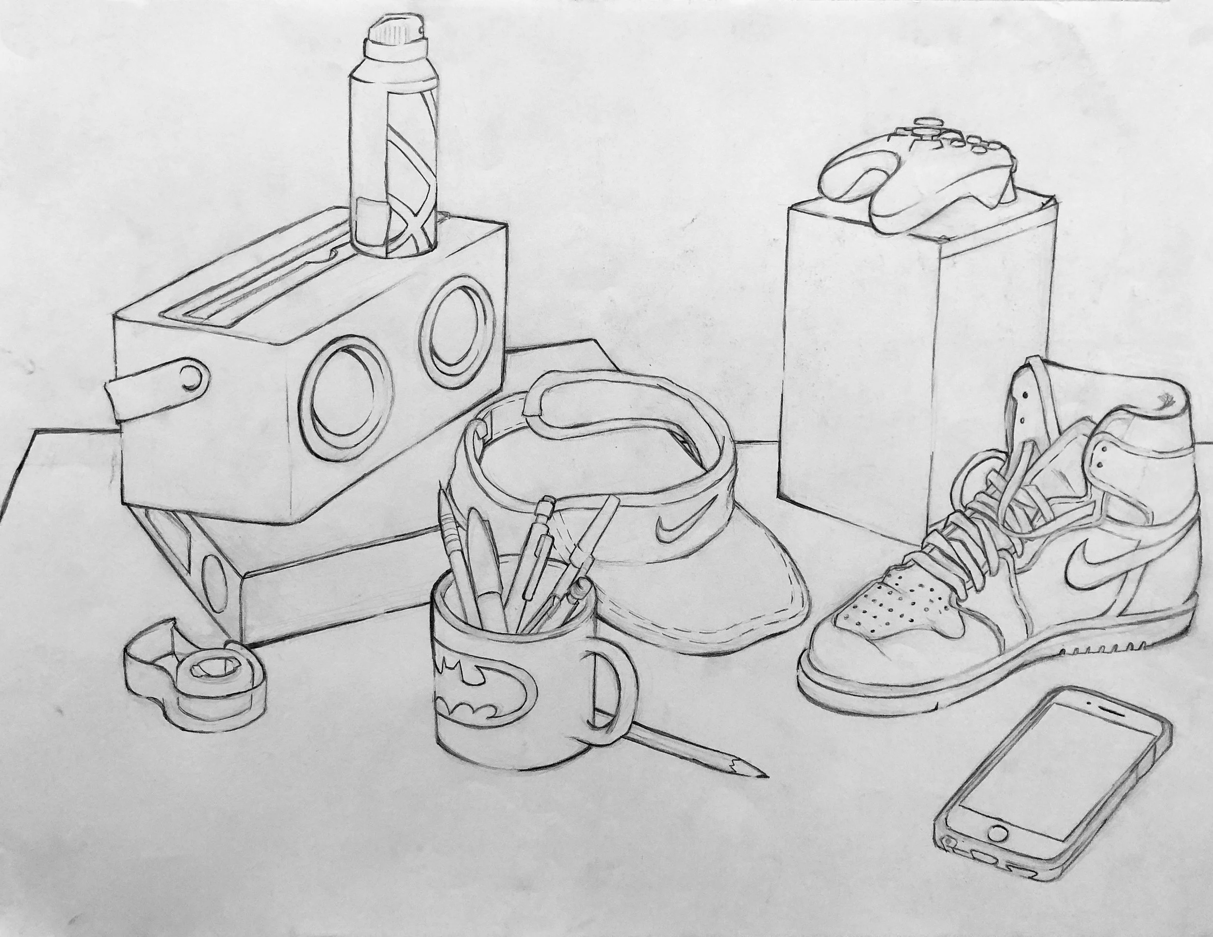 Observational still life drawing with value, charcoal on paper, 18x24”