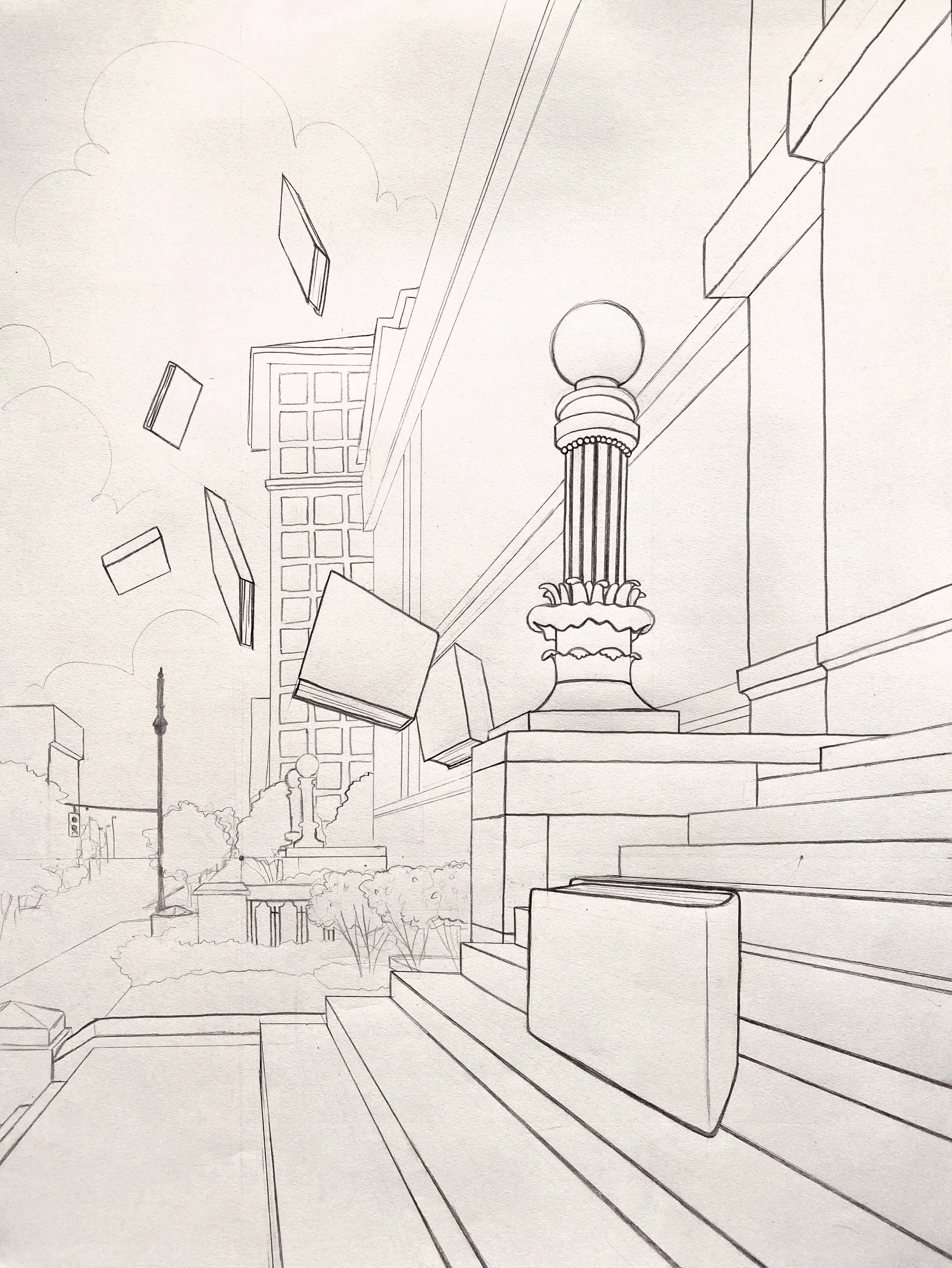 Linear perspective drawing with line and added narrative element, graphite on paper, 18x24”